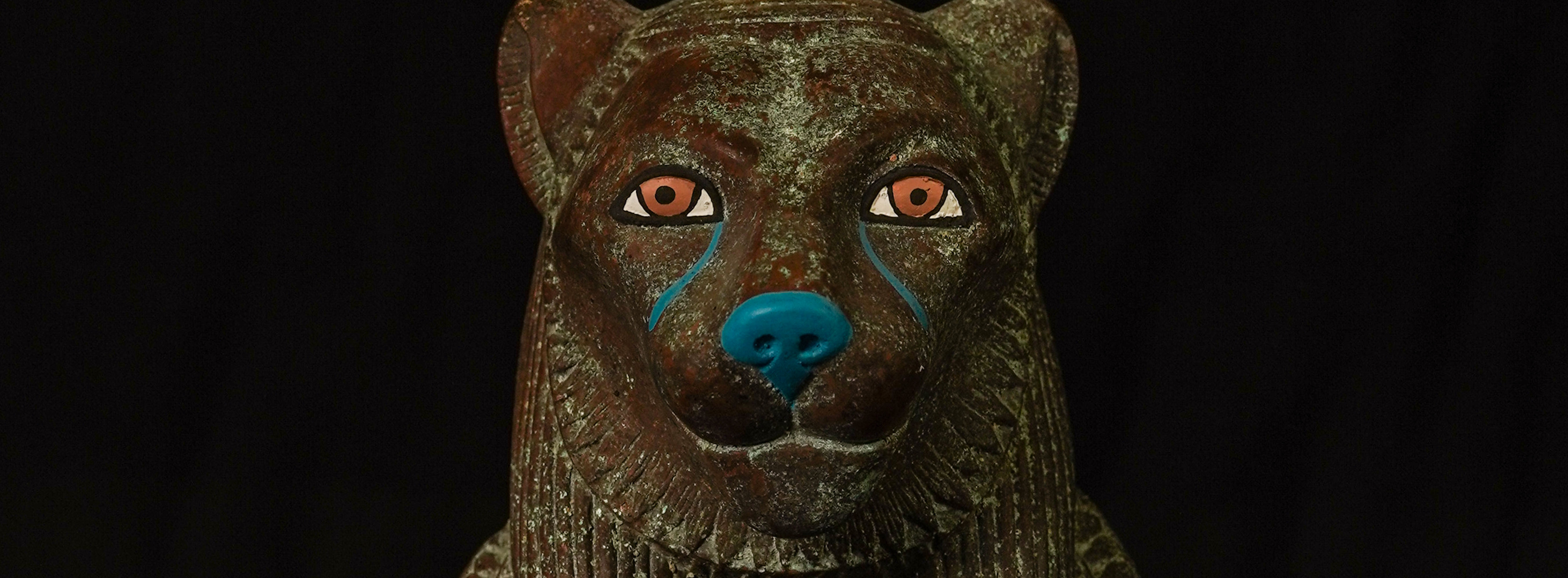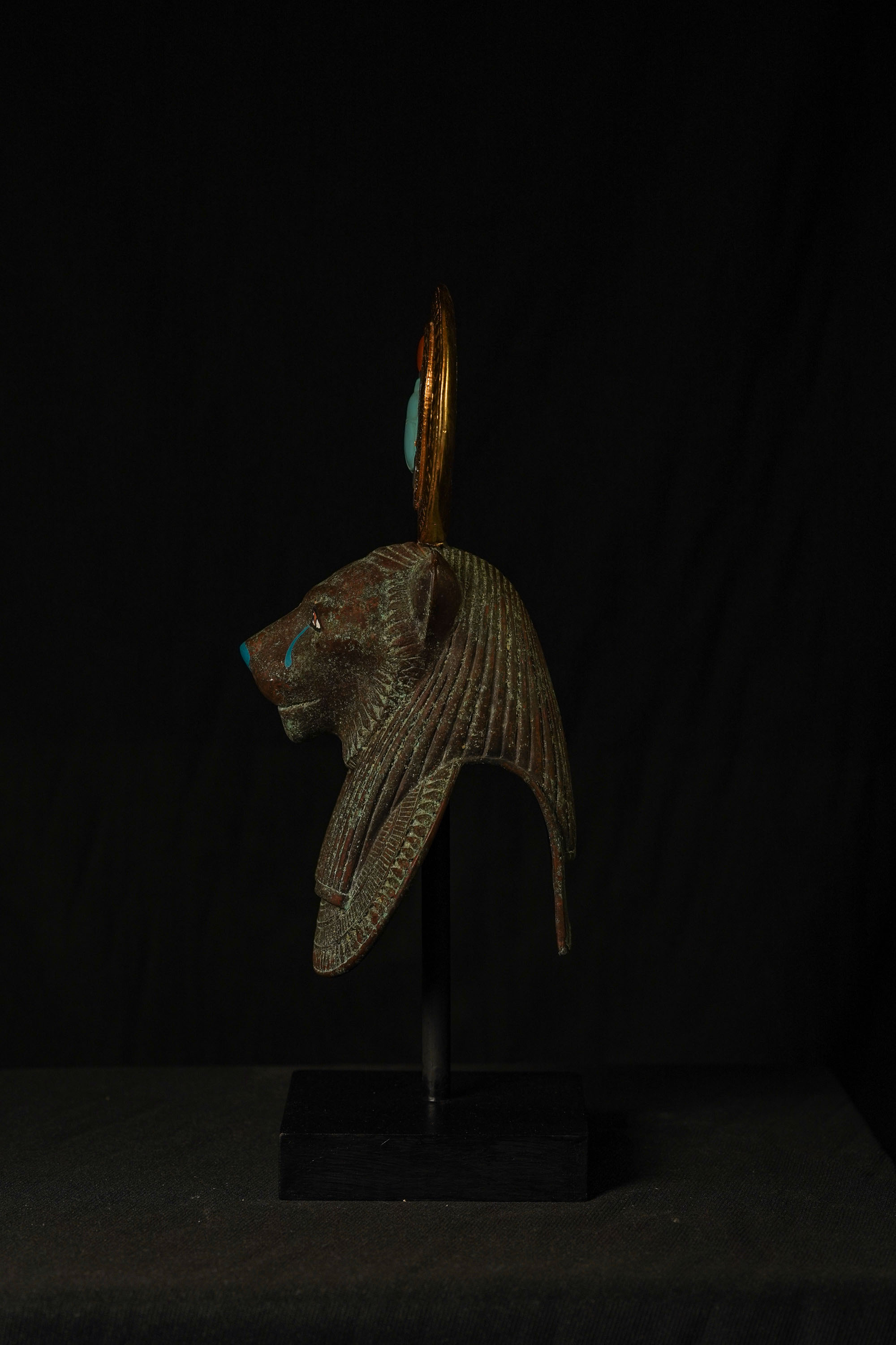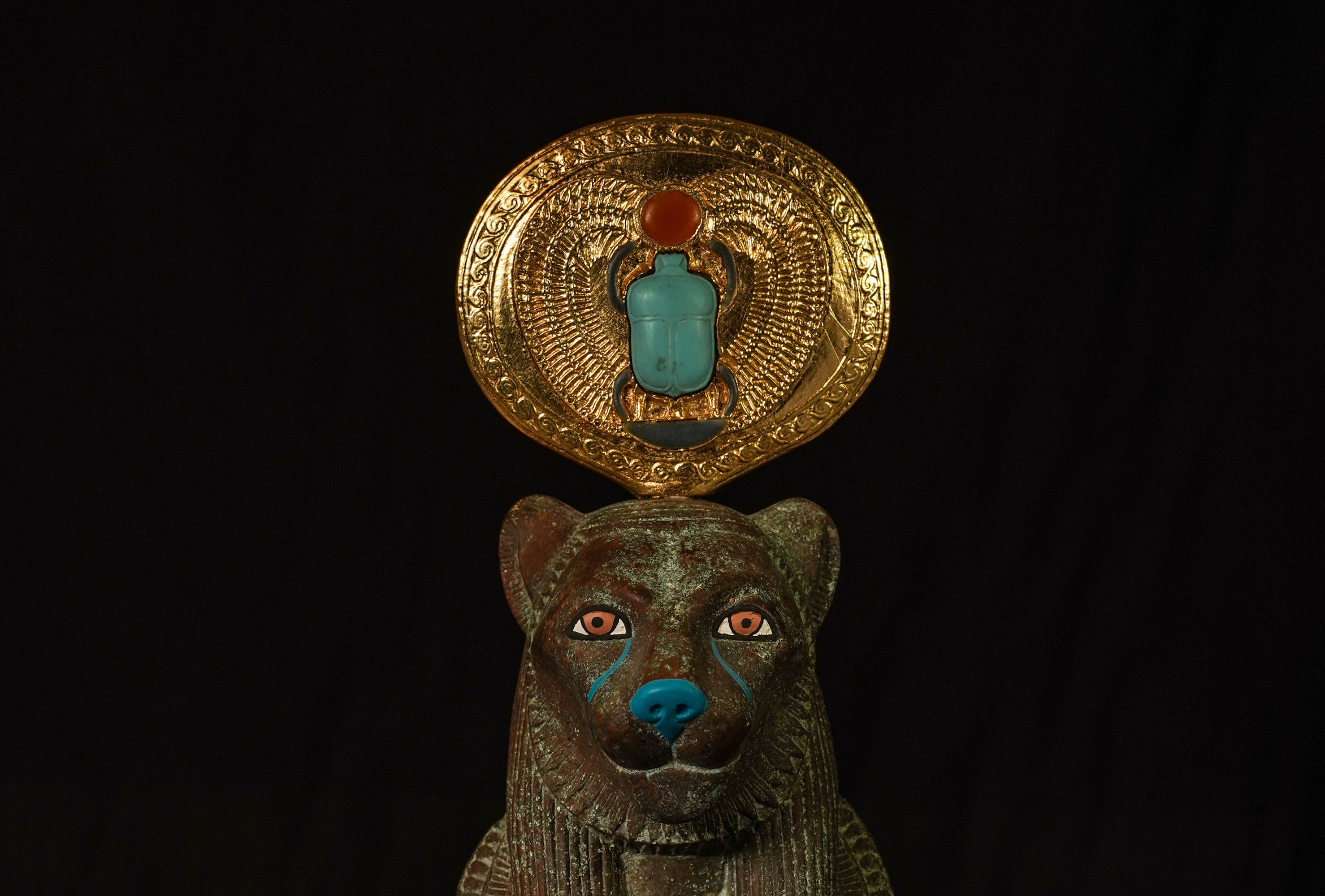 Goddess Sekhmet Museum Mask with Winged Scarab beetle sundial crown