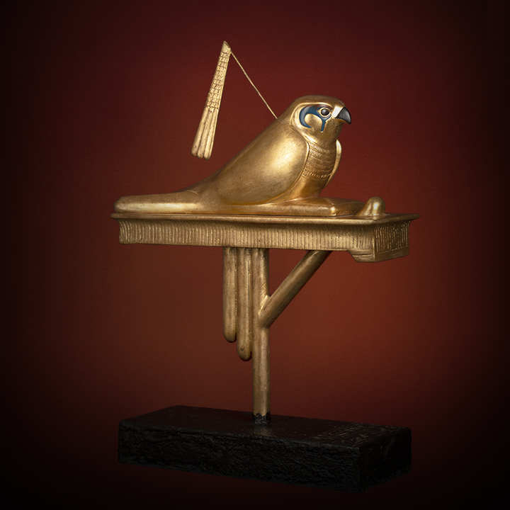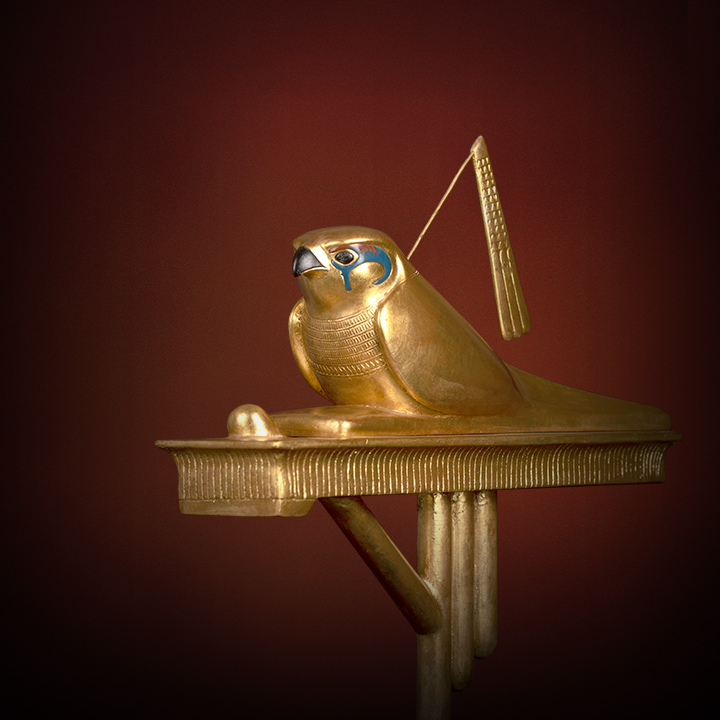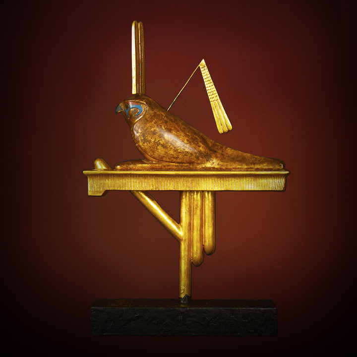 Description: A gilded wooden figure of Sopdu, the Egyptian deity of Saft el-Henna in the eastern Delta, depicted as a falcon with blue glass eyes and a royal association, symbolizing protection over the king's interests in foreign lands.